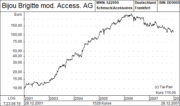 Bijou Brigitte war der erste sog. „Tenbagger“ unseres Musterdepots, also eine Aktie die sich mehr als verzehnfacht hat. Und das war kein Zufall, denn die Schmuckkette war ein Value-Investment par excellence. Bijou hatte zum Zeitpunkt unseres Einstiegs nicht nur über viele Jahre wachsende Umsätze und Gewinne verzeichnet, sondern war auch komplett schuldenfrei und häufte sogar jedes Jahr Barmittel an. Auch die Wettbewerbsposition war seinerzeit extrem stark, denn der wichtigste Wachstumstreiber (Eröffnung neuer Filialen) war problemlos auf weitere Standorte in Deutschland und Europa übertragbar. Darüber hinaus war die Unternehmen mit einer Dividendenrendite von regelmäßig über 5 % extrem eigentümerorientiert. Und schließlich war die Aktie über weite Teile der Haltedauer mit einem KGV von unter 15 äußerst moderat bewertet.