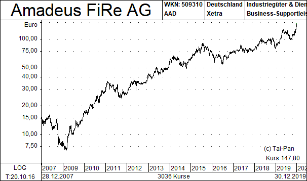 Fast ein wenig unscheinbar kommt unser dritter „Tenbagger“ daher, den wir Ihnen vorstellen möchten. Dass es sich dabei um den Personaldienstleister Amadeus FiRe handelt, zeigt allerdings, dass es keineswegs immer nur besonders „aufregende“ Unternehmen sein müssen, die sich zu wahren Kursraketen entwickeln. So erkennt man auch bei Amadeus Fire die besondere Stärke erst bei genauerem Hinsehen. Denn auf den ersten Blick arbeiten die Frankfurter in einer wettbewerbsintensiven und zyklischen Branche, die keine besondere Überrenditen erwarten lässt. Dort aber hat sich das Unternehmen auf die Nische der höherqualifizierten Fachkräfte, insbesondere aus dem IT- und kaufmännischen Bereich, spezialisiert. Das ermöglich zum einen höhere Margen als im Massengeschäft mit eher niedrigqualifizierten Kräften und führt zum anderen zu einer gewissen konjunkturellen Robustheit, da besagte Fachkräfte auch in Abschwungphasen benötigt werden. Bei Amadeus Fire entfachte diese Positionierung ein starkes Wachstum, von 2008 bis 2019 wurde der Umsatz verdoppelt und der Gewinn um mehr als 150 % gesteigert. Noch entscheidender für die starke Performance der Aktie war allerdings, dass sie zum Zeitpunkt unseres Einstiegs extrem günstig bewertet war. So lag das KGV gerade einmal bei 4 und die Dividendenrendite bei über 10 % – eine extrem hohe Sicherheitsmarge also, um auf steigende Gewinne zu spekulieren, die oberhalb der Markterwartungen liegen.